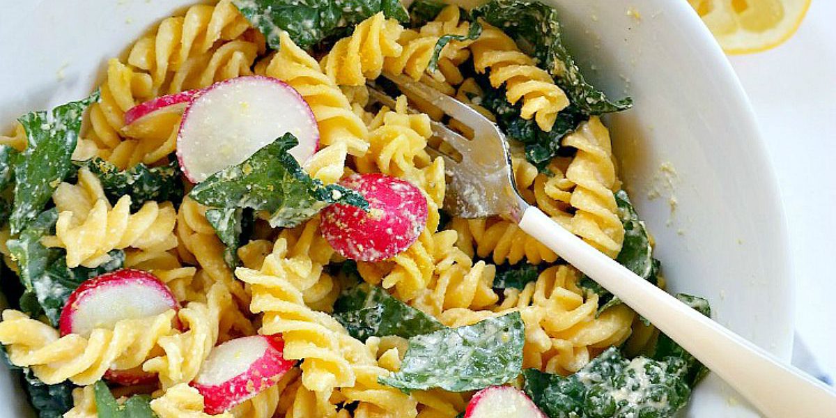 Kale caesar salad with pasta to enjoy